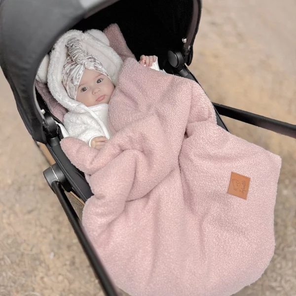 Wnętrze śpiworka wykonane jest z miękkiego weluru bawełnianego, który jest przyjazny dla skóry dziecka. Zewnętrzna warstwa to elegancka tkanina boucle o strukturze baranka. Wypełnienie stanowi antyalergiczna włóknina silikonowa, wszyta w szwy, co zapobiega jej przesuwaniu się podczas prania i użytkowania.