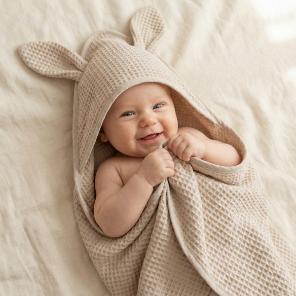 Delikatny, naturalny i praktyczny ręcznik niemowlęcy wafelkowy z kapturkiem, stworzony z myślą o komforcie i bezpieczeństwie najmłodszych. To niezbędny element wyprawki, idealny do codziennej pielęgnacji dziecka.