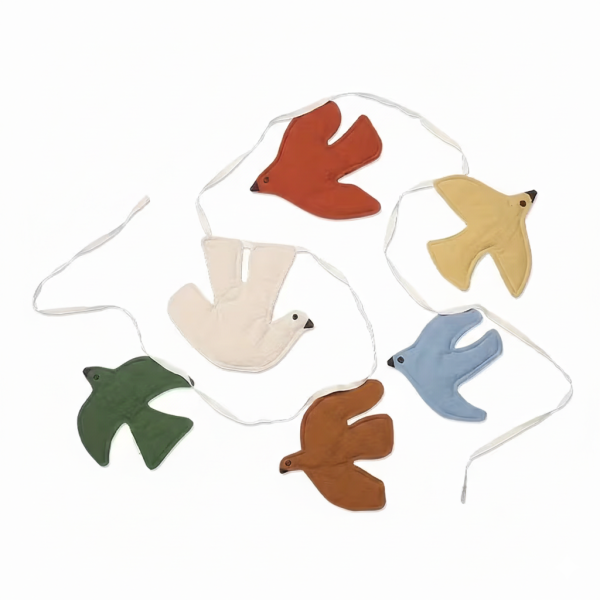 Dodaj wnętrzu lekkości i naturalnego uroku! Nasza tekstylna girlanda o długości 220 cm to stylowa dekoracja, która odmieni każdy pokój dziecięcy. Składa się z 6 miękkich, starannie uszytych ptaszków w pięknych, ziemistych kolorach, zawieszonych na subtelnej tasiemce.