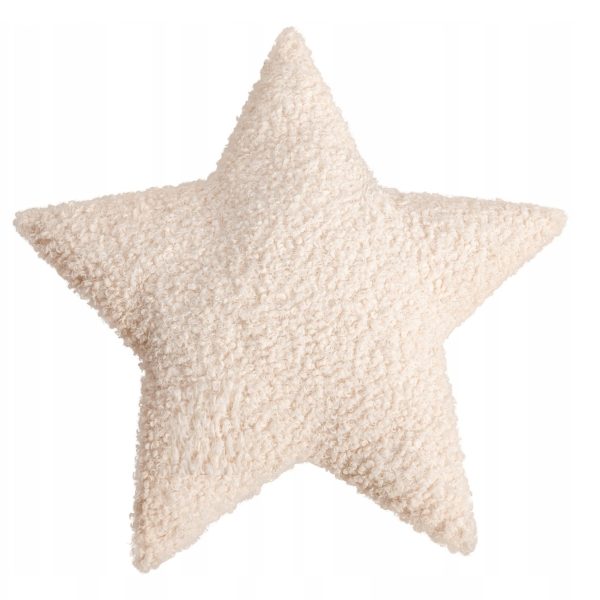 Urocza poduszka dekoracyjna w kształcie gwiazdki, uszyta z miękkiego materiału typu „baranek” w odcieniu ecru. Dzięki przyjemnej, puszystej strukturze idealnie ociepla wnętrze i dodaje mu przytulnego charakteru.