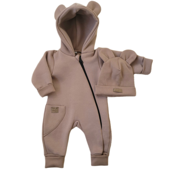 Pajacyk, dresowy kombinezon bez stóp z ocieplanej dresówki z kapturem + prążkowana podwójna czapka