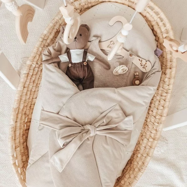 Nasz rożek niemowlęcy nie posiada rzepa – zamiast tego wiązany jest szeroką, ozdobną szarfą. Dzięki temu z łatwością dopasujesz go do potrzeb maluszka, tworząc wygodny otulacz. Szarfa nie tylko pełni funkcję praktyczną, ale również dodaje uroku całemu produktowi.