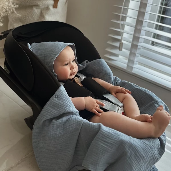 Niezwykle miękki i delikatny otulacz do fotelika, uszyty z najwyższej jakości muślinu bawełnianego double gaze.
