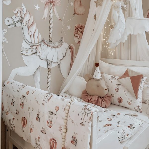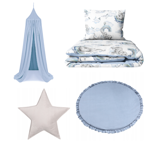 Gotowy, kolorystycznie dobrany zestaw do pokoju dziecięcego, polecany przez mamy. Spójny komplet, który pozwala szybko i łatwo stworzyć przytulną przestrzeń do snu i zabawy.