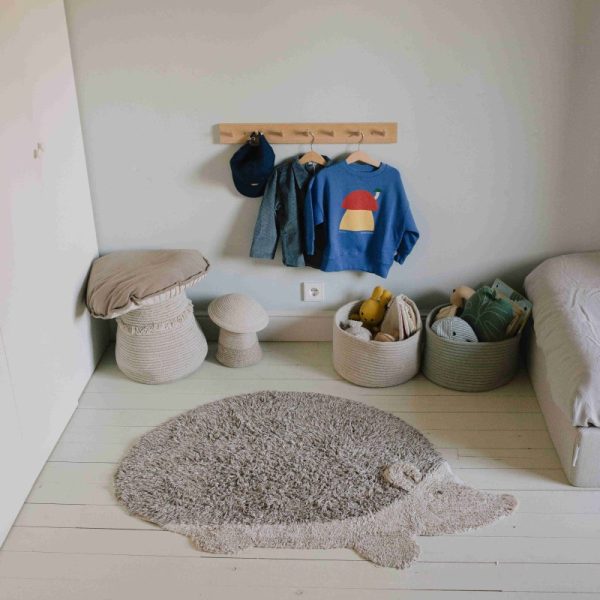 Poczuj się jak w lesie otoczonym grzybami dzięki dywanowi Jeż. Starannie wykonany bawełniany dywan w kształcie jeża w naturalnych kolorach i jasnych brązach, z długim włosiem i puszystą teksturą, która symuluje pióra jeża. Do ciała dodano łatkę przypominającą ucho z dodatkową objętością, którą można podnieść, oraz oko wykonane z plecionych węzłów. Dzięki swoim ziemistym kolorom, dywan ten dodaje odrobinę rustykalnego uroku do każdego pomieszczenia.