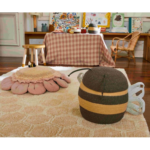 Kosz i zabawka jednocześnie. Kosz Baby Bee, o uroczym kształcie i rozmiarze pszczółki, jest zarówno schowkiem na skarby malucha, jak i towarzyszem zabaw. Wykonany ręcznie z ciemnoszarego bawełnianego sznurka połączonego z rzędami sznurków w kolorze miodowym, kosz Baby Bee ma delikatnie ukształtowane skrzydła w kolorze jasnoniebieskim i ciemnoszare anteny. Wraz z koszykiem Mama Bee doskonale łączą się ze wszystkimi dywanikami z kolekcji, aby udekorować pokój w stylu, który przywołuje dni wiosny i natury.