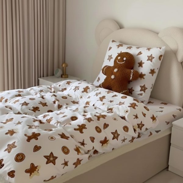 Dwustronny wzór – jedna strona zdobiona pierniczkami w kształcie serc, gwiazdek i ludzików, druga z delikatnym motywem śnieżynek – pozwala łatwo zmieniać wystrój sypialni.