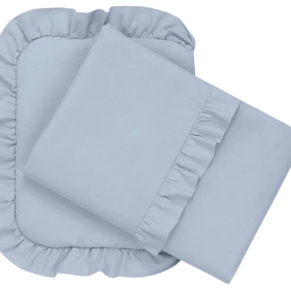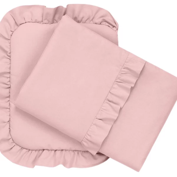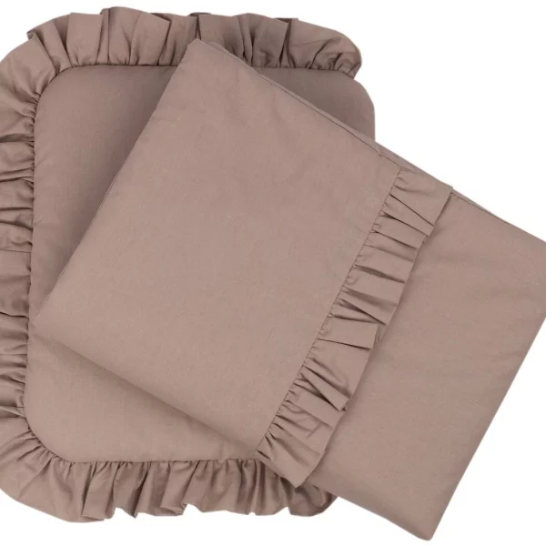 Poduszka obszyta jest z trzech stron falbanką, natomiast kołderka posiada naszytą na wierzchu falbankę.