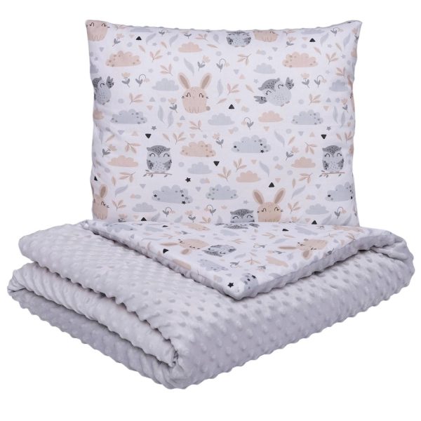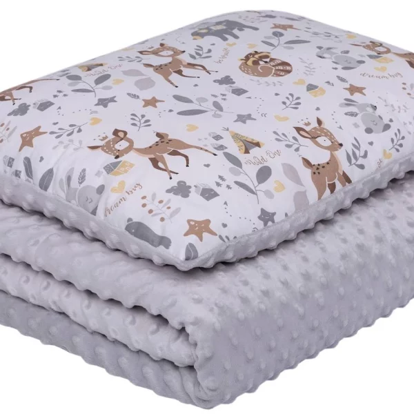 Zestaw jest dwustronny, z jednej strony zastosowaliśmy aksamitny, niezwykle delikatny w dotyku materiał Minky, który otuli dziecko ciepłem i poczuciem bezpieczeństwa. Z drugiej – oddychającą, 100% bawełnę w uroczych, dziecięcych wzorach.