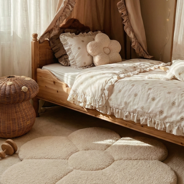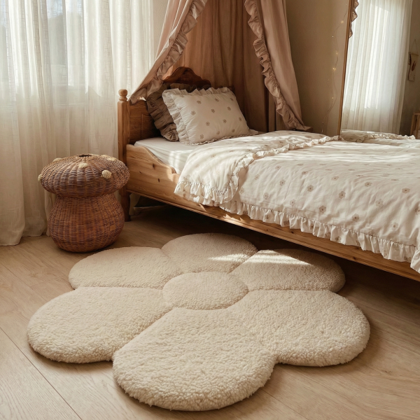 Mata do zabawy w kształcie kwiatka wykonana z tkaniny boucle. Wypełnienie stanowi włókno silikonowe, a poszycie z velvetu (100% poliester) zapewnia miękkość i komfort. Średnica 104 cm – rozmiar maxi. Produkt polski, idealny do pokoju dziecięcego. 🌸