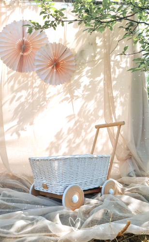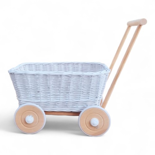 Wózek na zabawki/lalki posiada drewnianą rączkę, dzięki której dziecko może swobodnie pchać lub ciągnąć za sobą wiklinowy wózek. Wózek posiada drewnianą, stabilną rączkę.
