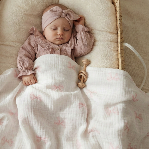 Delikatny otulacz muślinowy w różowe kokardki, idealny od pierwszych dni życia dziecka. Wykonany z 100% bawełny muślinowej, jest lekki, miękki i przyjemny w dotyku, zapewniając komfort oraz poczucie otulenia. Subtelny wzór w kokardki sprawia, że otulacz doskonale sprawdzi się zarówno na co dzień, jak i jako element wyprawki lub stylowy dodatek do pokoju dziecięcego. 🎀
