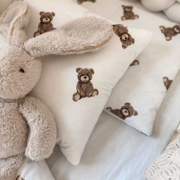 Zapewnij swojemu dziecku komfort i delikatność podczas letnich dni dzięki naszemu szytemu z najwyższą starannością zestawowi muślinowemu, który składa się z poduszki w kształcie misia i lekkiego kocyka / otulacza.