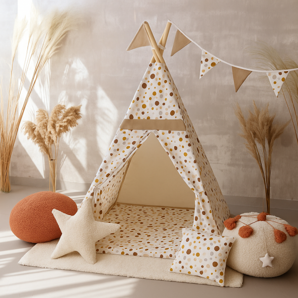 Namiot tipi to idealna przestrzeń do zabawy, czytania i odpoczynku, która pięknie wkomponuje się w wystrój pokoju dziecięcego. Lekka konstrukcja i naturalne materiały sprawiają, że tipi jest bezpieczne, wygodne i praktyczne.