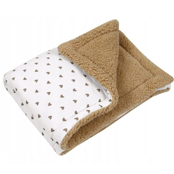 Przytulny, miękki i lekki kocyk, który otuli maluszka podczas snu i zabawy. Z jednej strony uszyty z puszystej tkaniny typu baranek w ciepłym, brązowym odcieniu, a z drugiej z oddychającego muślinu ozdobionego subtelnym wzorem serduszek.