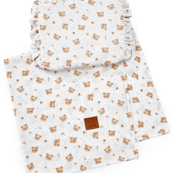 Komplet składa się z poduszki w kształcie misia o wymiarach około 30x35cm oraz otulacza 70x100cm.