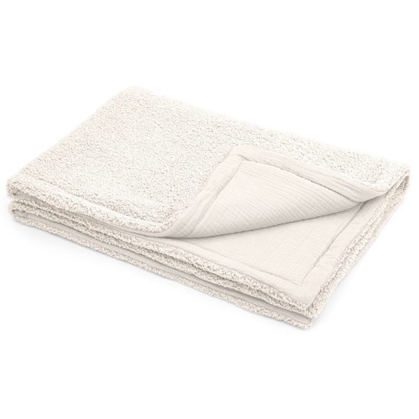 Ten kocyk to niezbędny element jesiennej i zimowej wyprawki. Łączy w sobie miękkość tkaniny barankowej – Boucle z naturalnością muślinu. Puszysta, modna tkanina Boucle zatrzymuje ciepło i nadaje kocykowi luksusowy, mięsisty wygląd, a delikatny, 100% bawełniany Muślin Double Gauze zapewnia kontakt z naturalną tkaniną i doskonałą oddychalność, minimalizując ryzyko przegrzania.