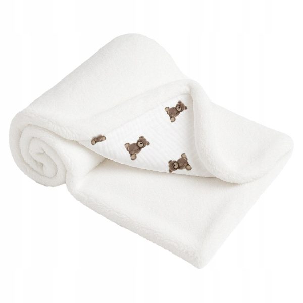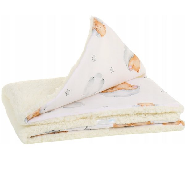 Miękki i przytulny kocyk, który otuli maluszka od pierwszych dni życia. Z jednej strony wykonany z puszystej tkaniny typu baranek w subtelnym kolorze ecru, a z drugiej z lekkiego i przewiewnego muślinu ozdobionego uroczym wzorem misiów na chmurkach.