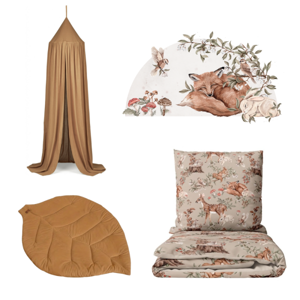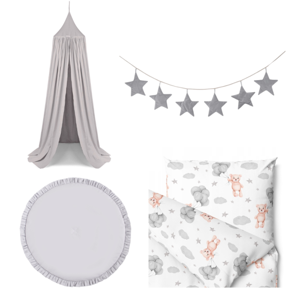 Gotowy, kolorystycznie dobrany zestaw do pokoju dziecięcego, polecany przez mamy. Spójny komplet, który pozwala szybko i łatwo stworzyć przytulną przestrzeń do snu i zabawy.