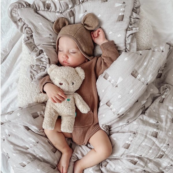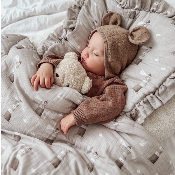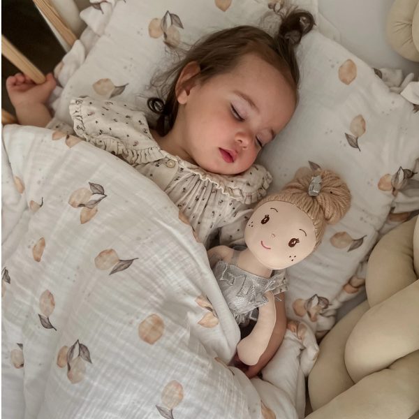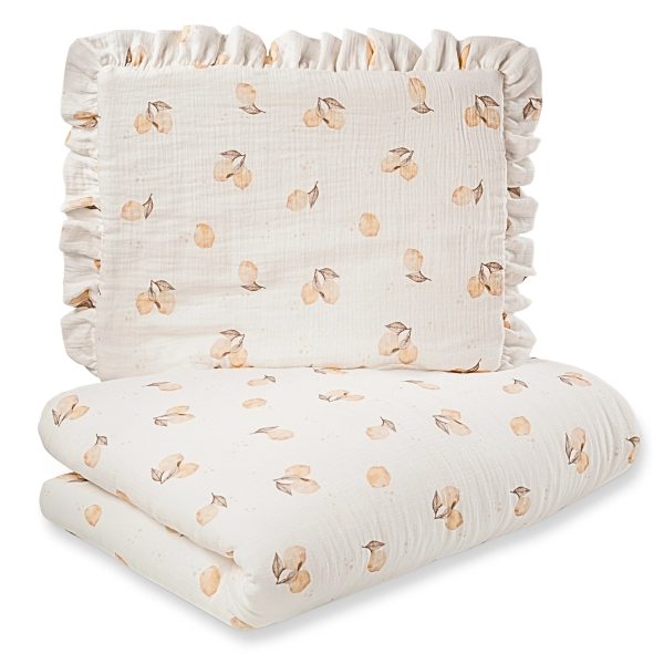 Komplet pościeli uszyty z najwyższej jakości muślinu bawełnianego double gaze. Składa się z poduszki w rozmiarze 40x50cm obszytej dekoracyjną falbanką oraz kołderki 120x90cm.