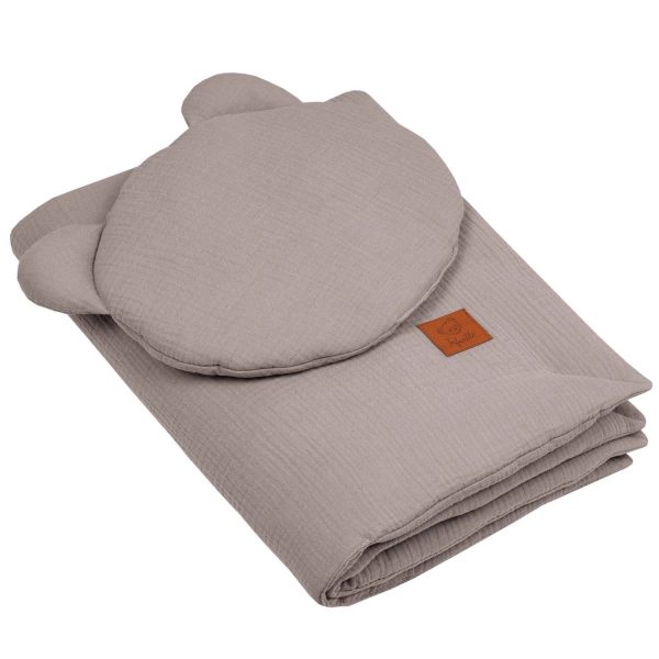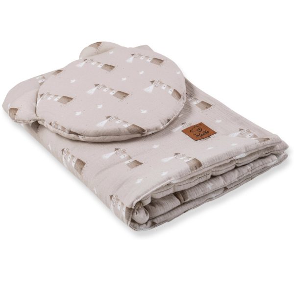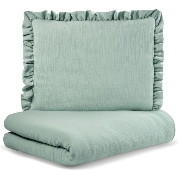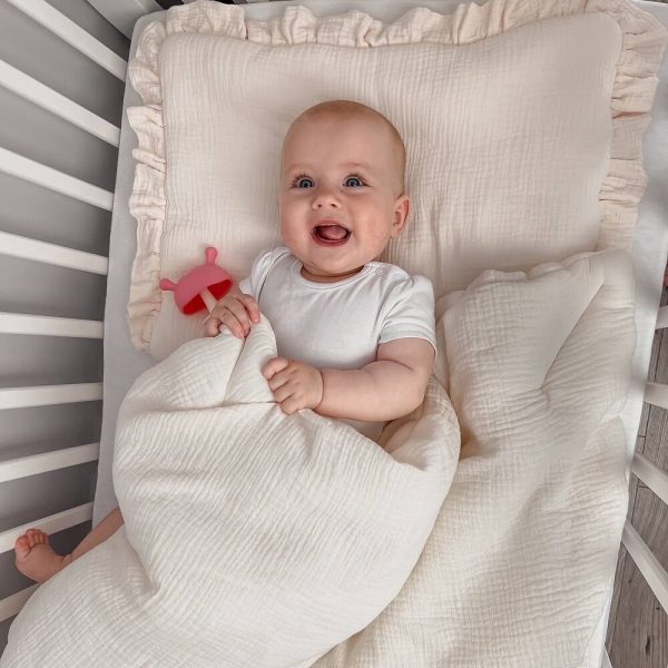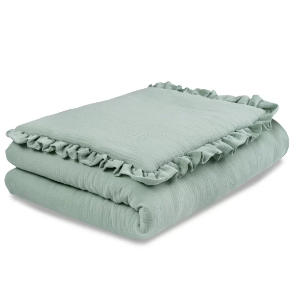 Komplet pościeli uszyty z najwyższej jakości muślinu bawełnianego double gaze. Składa się z poduszki w rozmiarze 40x50cm obszytej dekoracyjną falbanką oraz kołderki 120x90cm.
