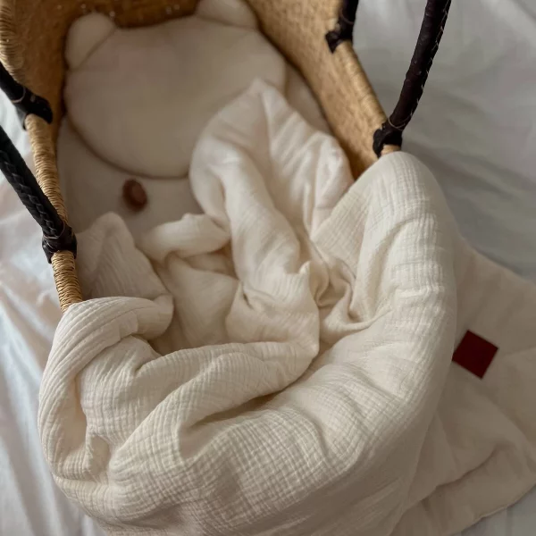Kołderka muślinowa z wszytym na stałe wypełnieniem zapewni ciepły i spokojny sen maluszkowi. Wypełnienie jest wszyte w szwy oraz dodatkowo przeszyte w rogach , aby nie ulegało przemieszczeniu podczas prania i użytkowania.