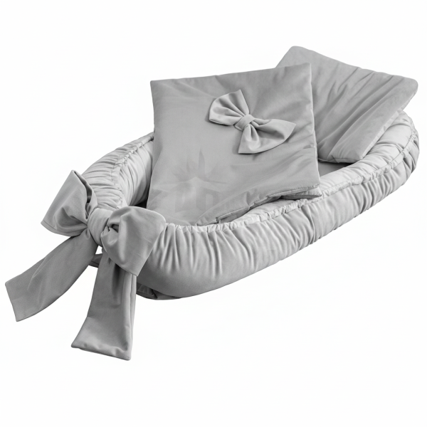 Elegancki, dwustronny kokon niemowlęcy z kokardą w zestawie z poduszką i kocykiem. Przeznaczony dla dzieci od 0 do ok. 8 miesiąca życia. Otulający kształt zapewnia maluszkowi poczucie bezpieczeństwa i komfortowy odpoczynek – w łóżeczku, na sofie czy na dywanie.