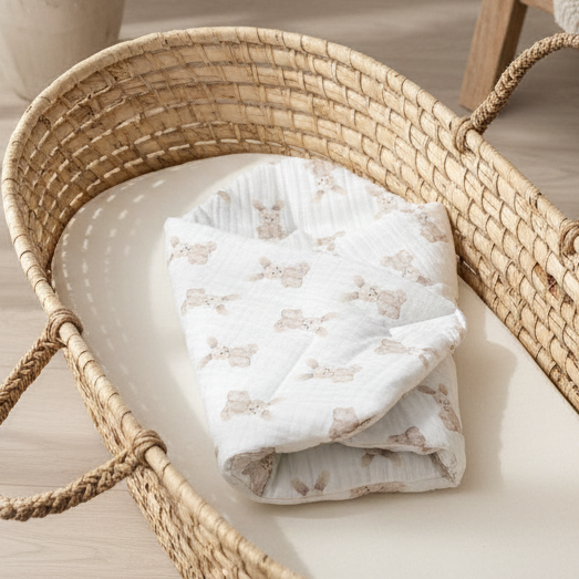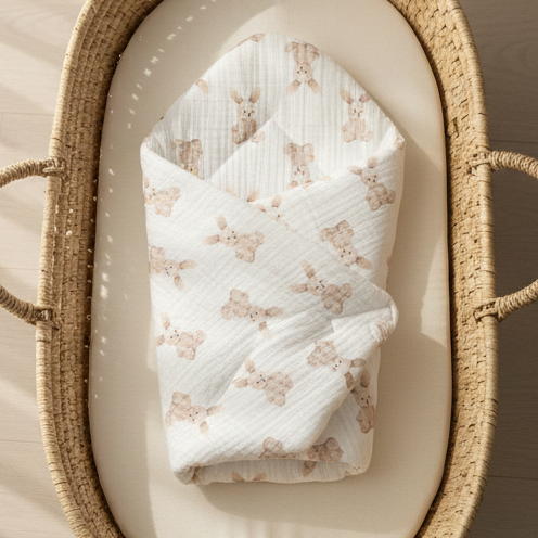 Materiał zewnętrzny muślin kreszowany 100% bawełna, wewnątrz poliestrowa włóknina,