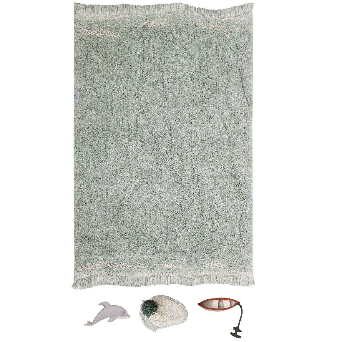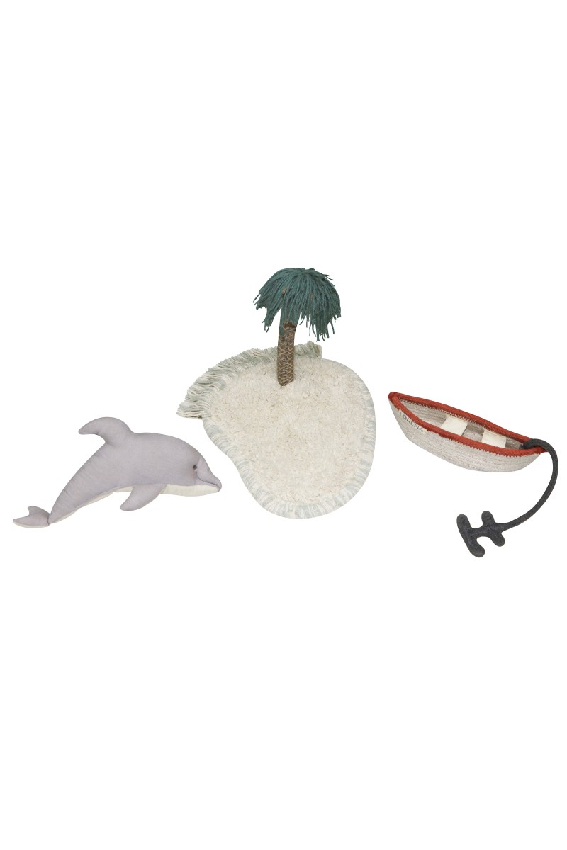 Do dywanika dołączony jest zestaw ręcznie wykonanych akcesoriów, które wzbogacają jego wartość i możliwości zabawy. Znajdziesz w nim małą wyspę z palmą, która stworzy idealne miejsce do układania scenek i opowieści. Łódź z kotwicą wykonana z plecionych sznurków umożliwi maluchowi odbycie wypraw w morskie rejony, a wykonany z bawełny organicznej delfin dodaje dodatkowego uroku i zachęca do kreatywnych przygód.