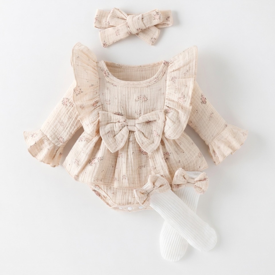 Body muślinowe z kokardą w kwiatuszki + opaska + skarpetki NS