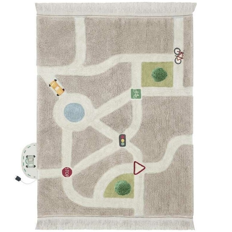 Czas na zabawę w Eco-City! To miejsce, w którym dzieci uczą się przez zabawę, gdzie pojazdy elektryczne są czyste i ciche –  dobre dla środowiska. Nasz bestseller Dywan Mapa Miasta teraz dostępny w większym rozmiarze, wykonany z miękkiej bawełny dywan jest dostarczany z torbą pełną zabawnych akcesoriów do zaprojektowania własnego miasta. Głównym kolorem jest kamienny beż, a dywan przedstawia wzór ulic w kolorze naturalnym, fontannę w kolorze Aqua blue i parki w delikatnym kolorze oliwkowym. Dywan jest wykończony krótkimi frędzlami i zawiera rzemieślniczo wykonane bawełniane samochody, drzewa, znaki drogowe i miejsce do ładowania samochodów elektrycznych.