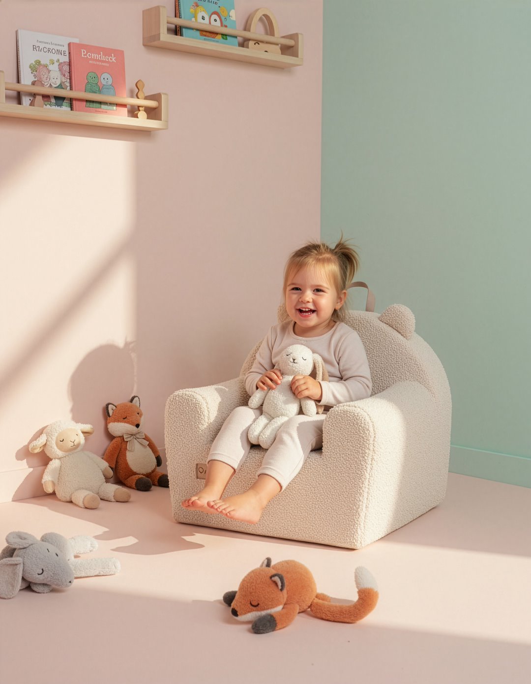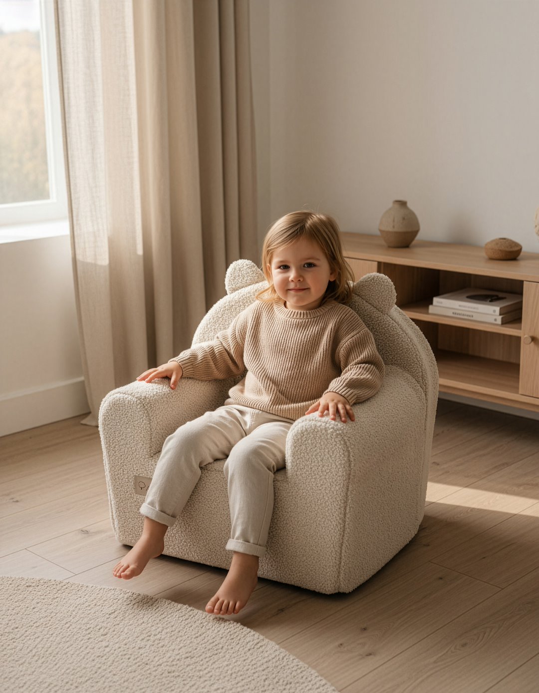 Ten uroczy, lekki fotelik został zaprojektowany z myślą o małych użytkownikach, którzy zaczynają samodzielnie siedzieć. Jest idealny do zabawy, czytania książeczek oraz wygodnego odpoczynku. Pokryty jest w całości modną, puszystą tkaniną typu Boucle popularnie zwanej “barankiem”, która wprowadza do każdego wnętrza ciepło i przytulny klimat.