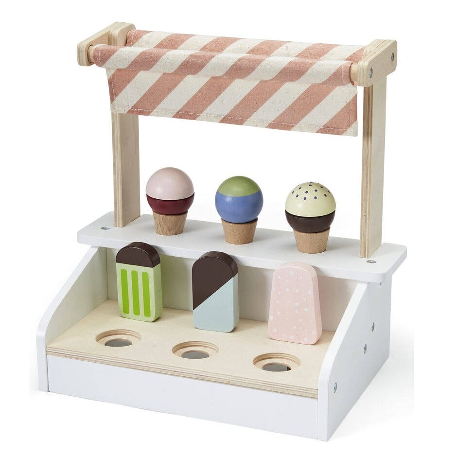Zestaw z lodami – niezbędny na letnim przyjęciu – może stać się świetną inspiracją do zabawy. Informacje dodatkowe: Materiał Stojak na lody: sklejka lipowa. Wafelek, patyk: buk. Lody: schima. Tkanina: bawełna. Zabawka nieodpowiednia dla dzieci poniżej trzeciego roku życia. Certyfikaty: EN71, oznaczenie CE Instrukcja czyszczenia: Czyść wilgotną ściereczką. Wytrzyj do sucha czystą szmatką. Regularnie sprawdzaj, czy wszystkie śruby są dokręcone, a części pozostają nienaruszone.