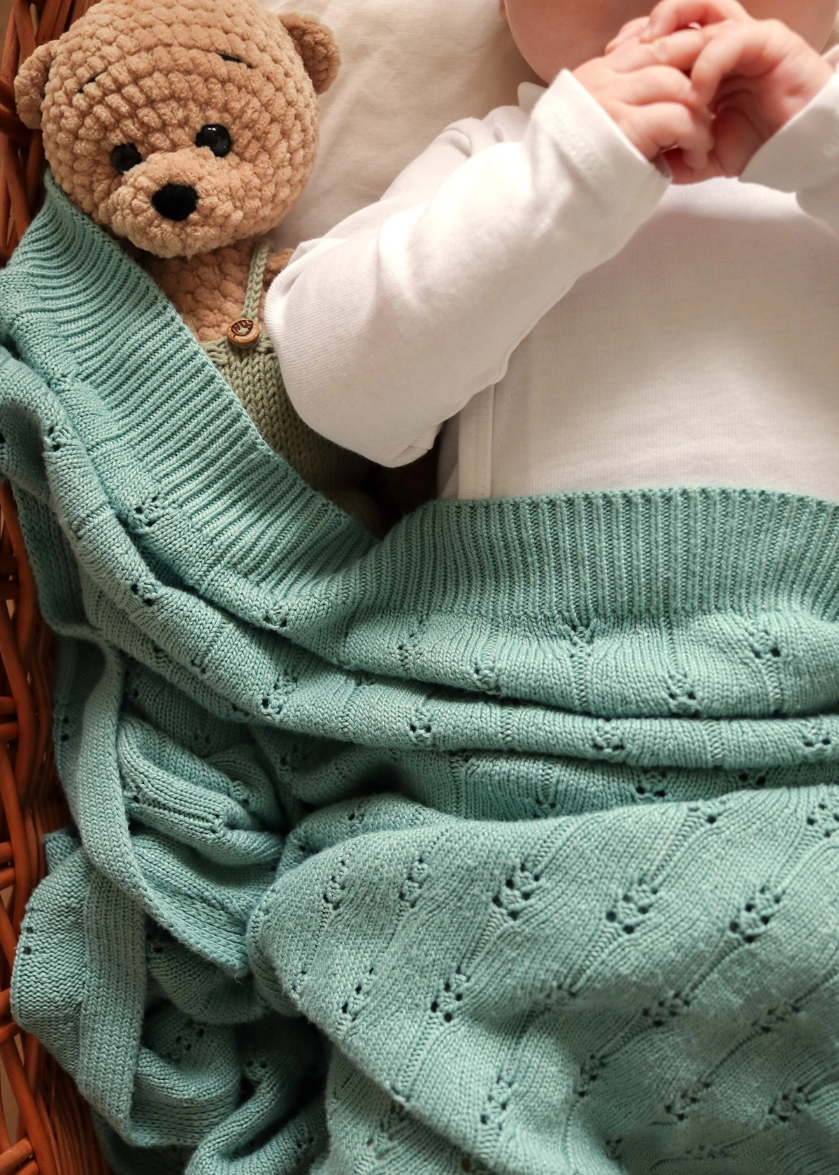 Dzięki swojemu ażurowemu splotowi kocyk jest przewiewny i oddychający – idealnie nadaje się na upalne dni.