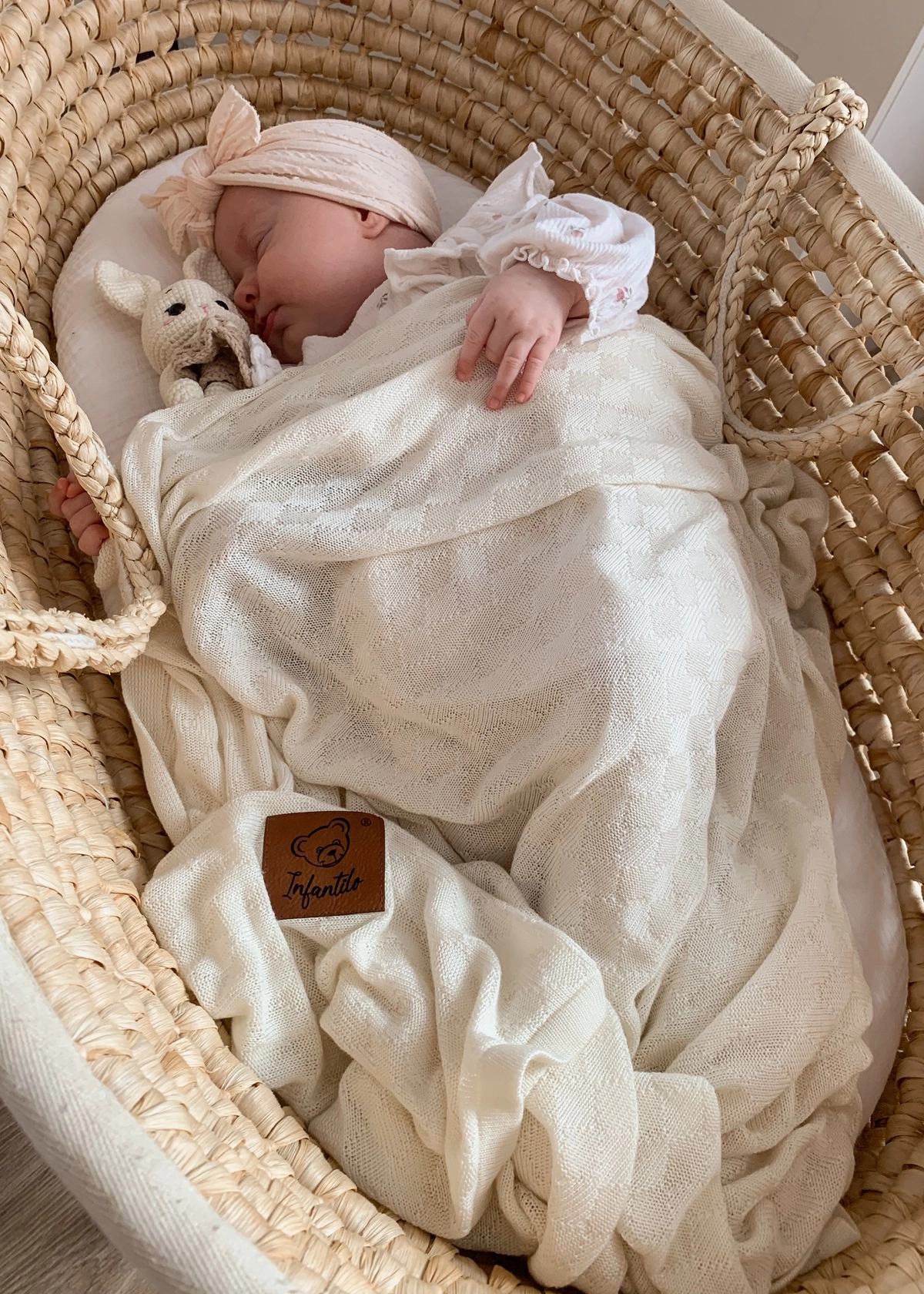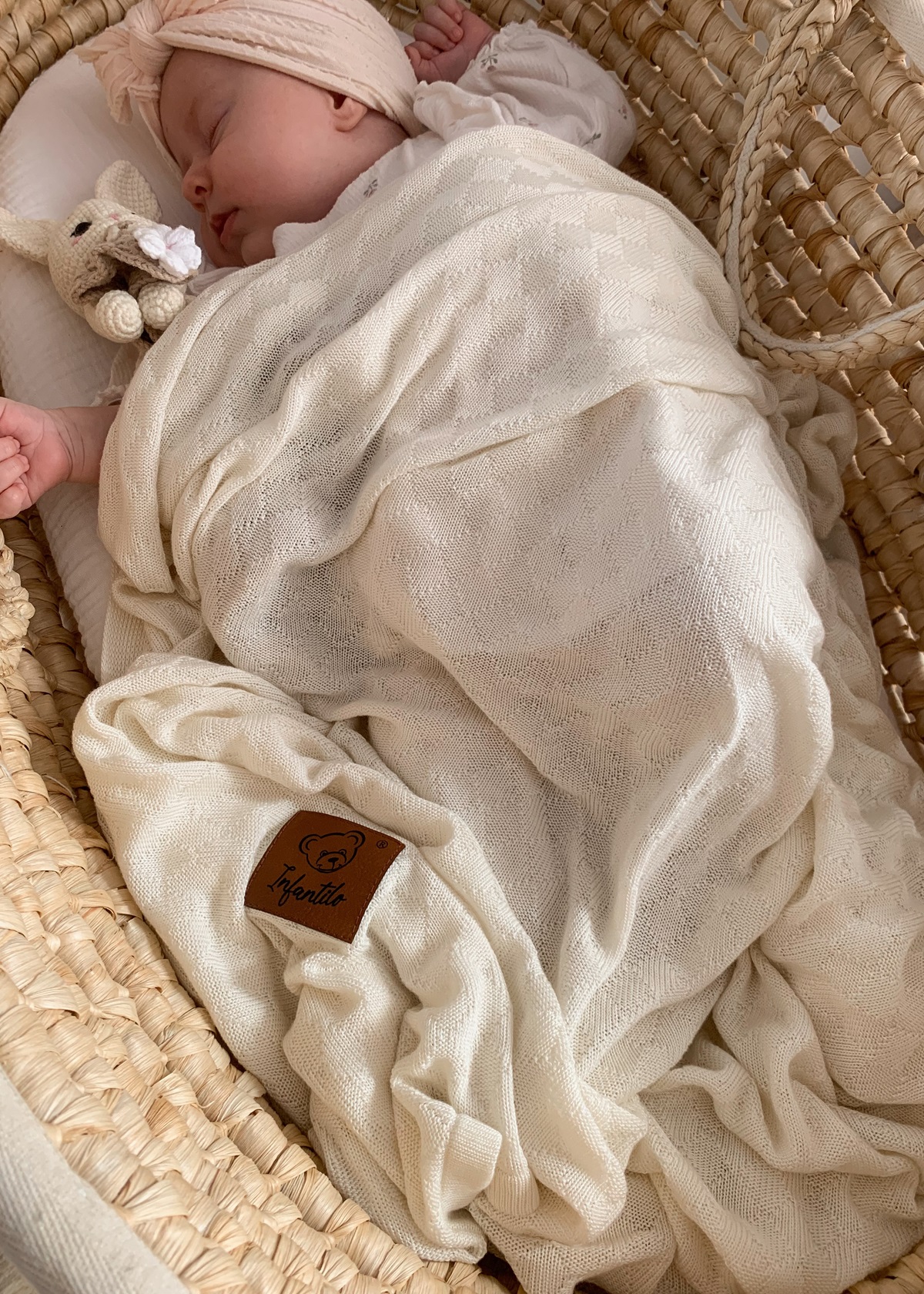 Ten kocyk to nie tylko piękny dodatek do dziecięcej wyprawki – to bezpieczna i przemyślana otulinka na każdą porę roku. Uszyty w 100% z bambusowej przędzy o wyjątkowym splocie małych rombów. Otulacz dziany jest bardzo delikatny i lekki jak chmurka. Użyty materiał posiada niezwykłe właściwości termoregulacyjne, dzięki czemu możemy z niego korzystać przez cały rok