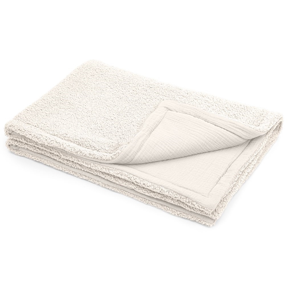 Ten kocyk to niezbędny element jesiennej i zimowej wyprawki. Łączy w sobie miękkość tkaniny barankowej – Boucle z naturalnością muślinu. Puszysta, modna tkanina Boucle zatrzymuje ciepło i nadaje kocykowi luksusowy, mięsisty wygląd, a delikatny, 100% bawełniany Muślin Double Gauze zapewnia kontakt z naturalną tkaniną i doskonałą oddychalność, minimalizując ryzyko przegrzania.