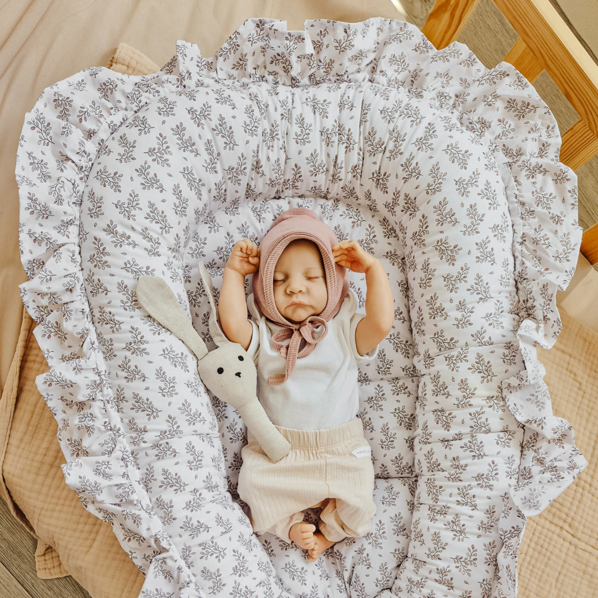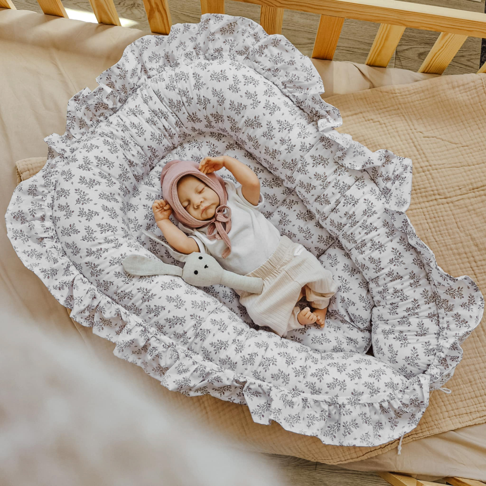 Kokon niemowlęcy Gałązki Beżowe falbanką – 100% bawełna, polski produkt