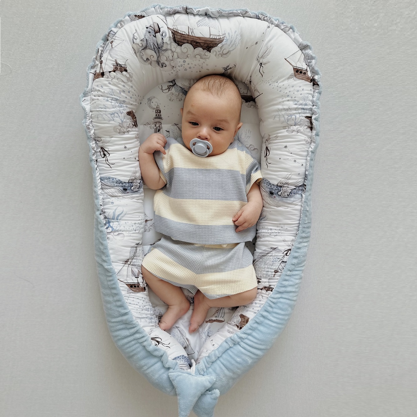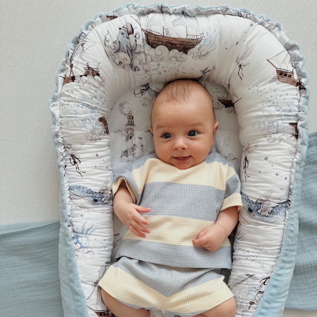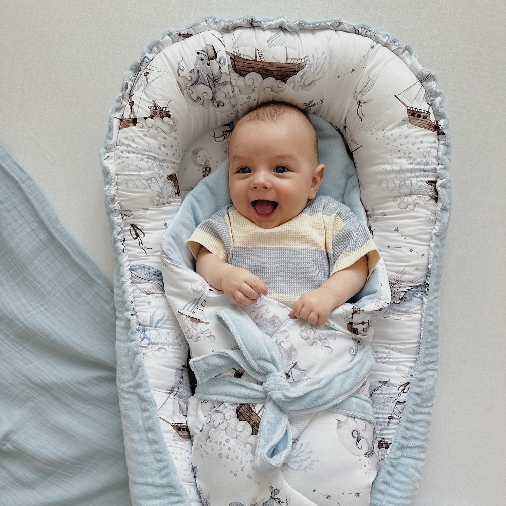 Kokon niemowlęcy to przytulne miejsce stworzone dla każdego maluszka od pierwszych dni życia. Gniazdko daje poczucie bezpieczeństwa, chroniąc maleństwo przed sturlaniem się lub przypadkowym przygnieceniem, gdy śpi z rodzicami w jednym łóżku. Służy jako pierwsza mata do zabawy i miejsce do nauki trzymania główki.