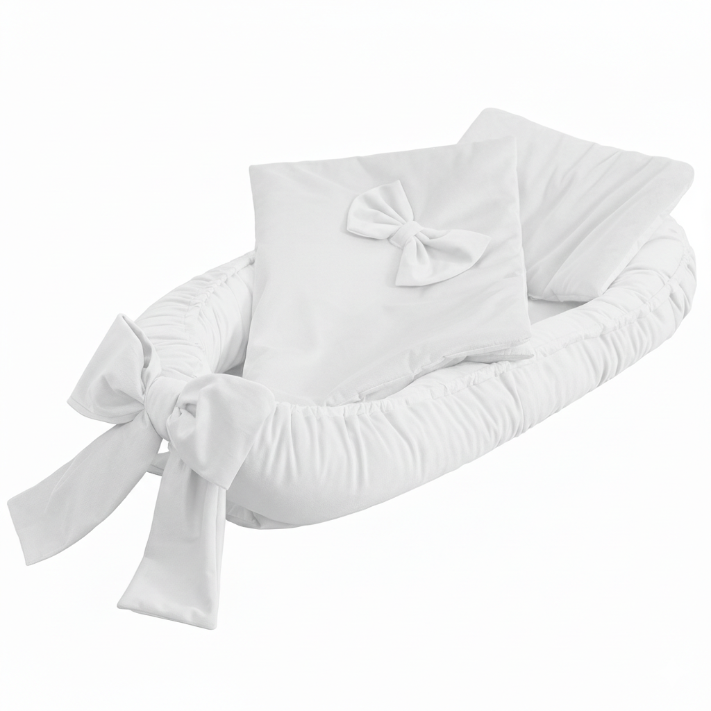 Kokon niemowlęcy velvet z kokardą kocykiem i poduszką 3w1 biały Baby R