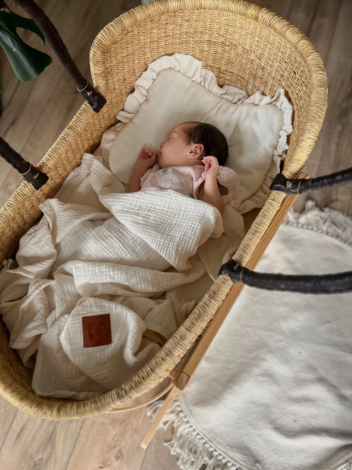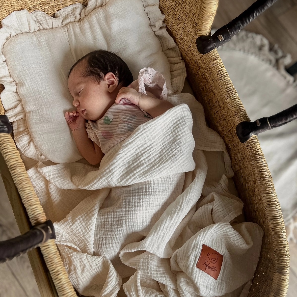 Uszyty z najwyższej jakości muślinu bawełnianego double gaze. Tkaniny miękkiej i delikatnej, dedykowanej dla skóry niemowląt i dzieci.