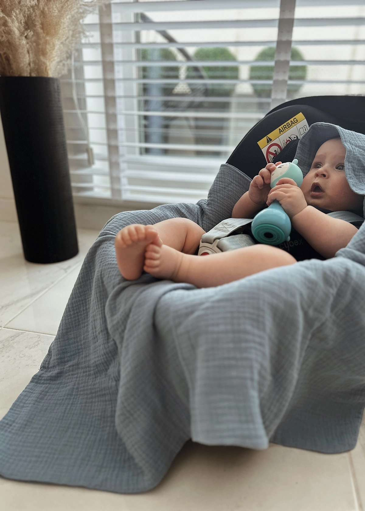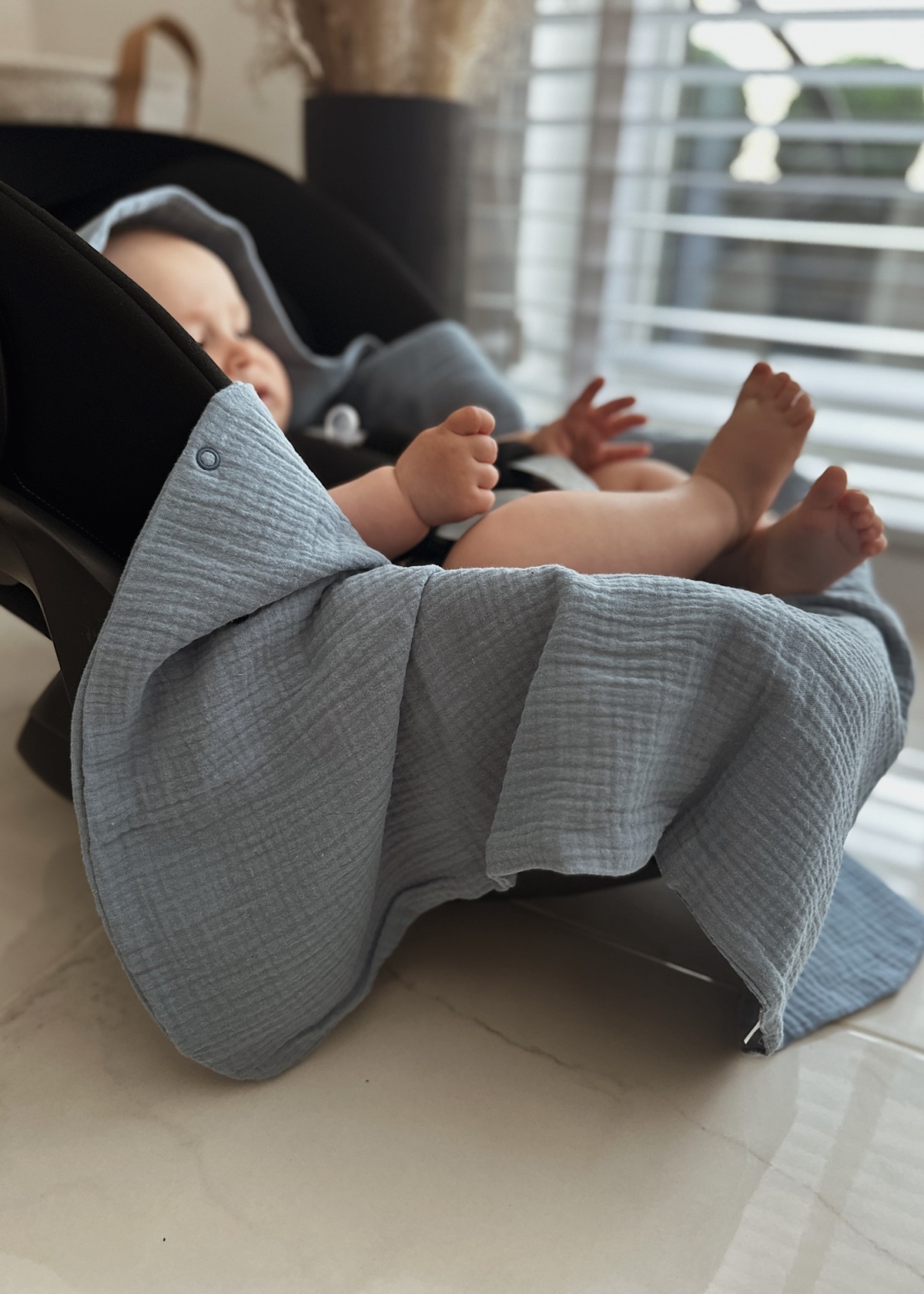 Niezwykle miękki i delikatny otulacz do fotelika, uszyty z najwyższej jakości muślinu bawełnianego double gaze.