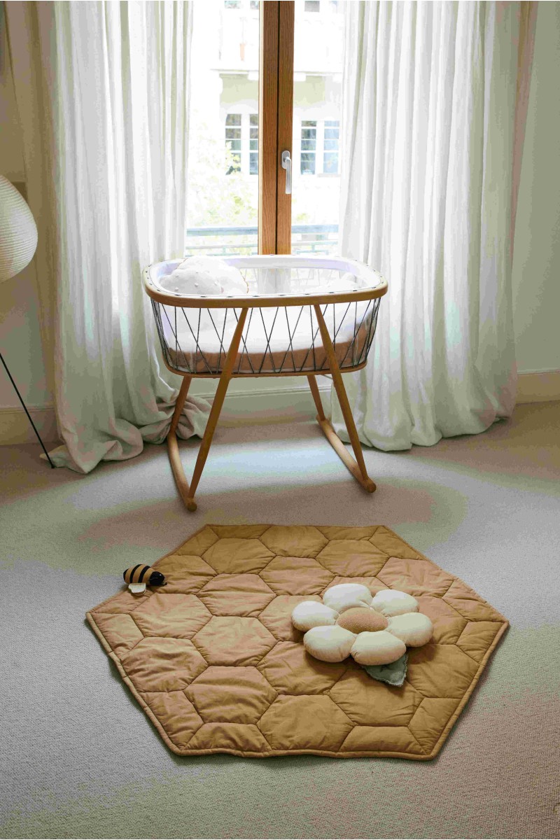 Interaktywna przestrzeń do zabawy stymulująca zmysły dziecka. Mata Honeycomb ma sześciokątny kształt i jest pikowana w charakterystyczny wzór plastra miodu. Wykonana jest z miękkiej popeliny z bawełny organicznej w kolorze miodowym i wypełniona miękkim wypełnieniem z recyklingu. Do maty dołączona jest urocza grzechotka w kształcie pszczółki, która zawiera marszczony papier i grzechotkę w środku.