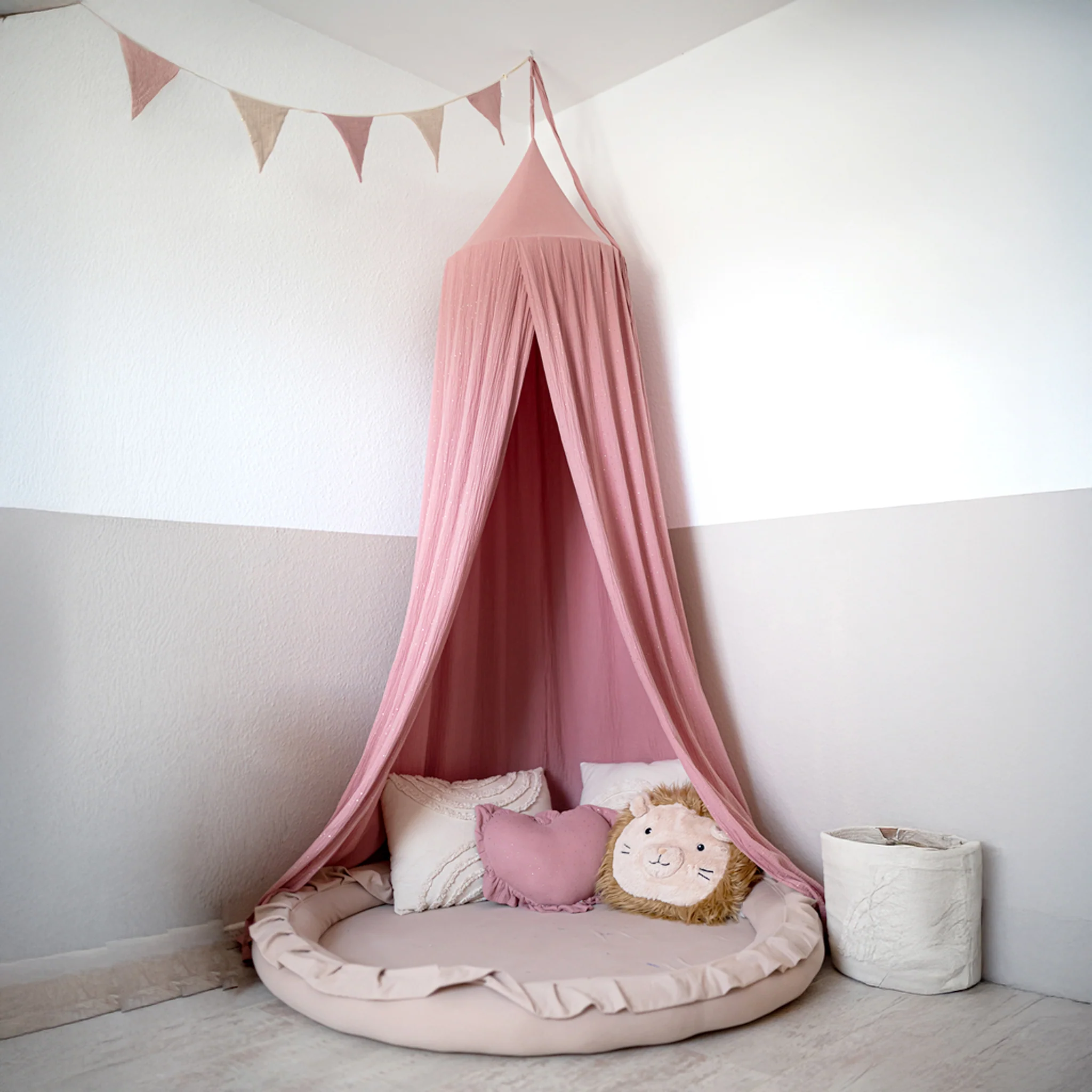 Stwórz wyjątkową, bajkową przestrzeń w pokoju dziecka. Baldachim wykonany z delikatnego muślinu ze złotymi drobinkami doda wnętrzu niepowtarzalnego uroku, tworząc przytulny kącik do snu, zabawy czy relaksu.