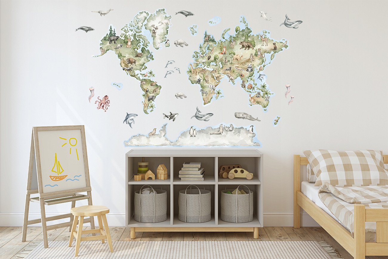 Naklejka ścienna XL Mapa Świata Zwierzęta als