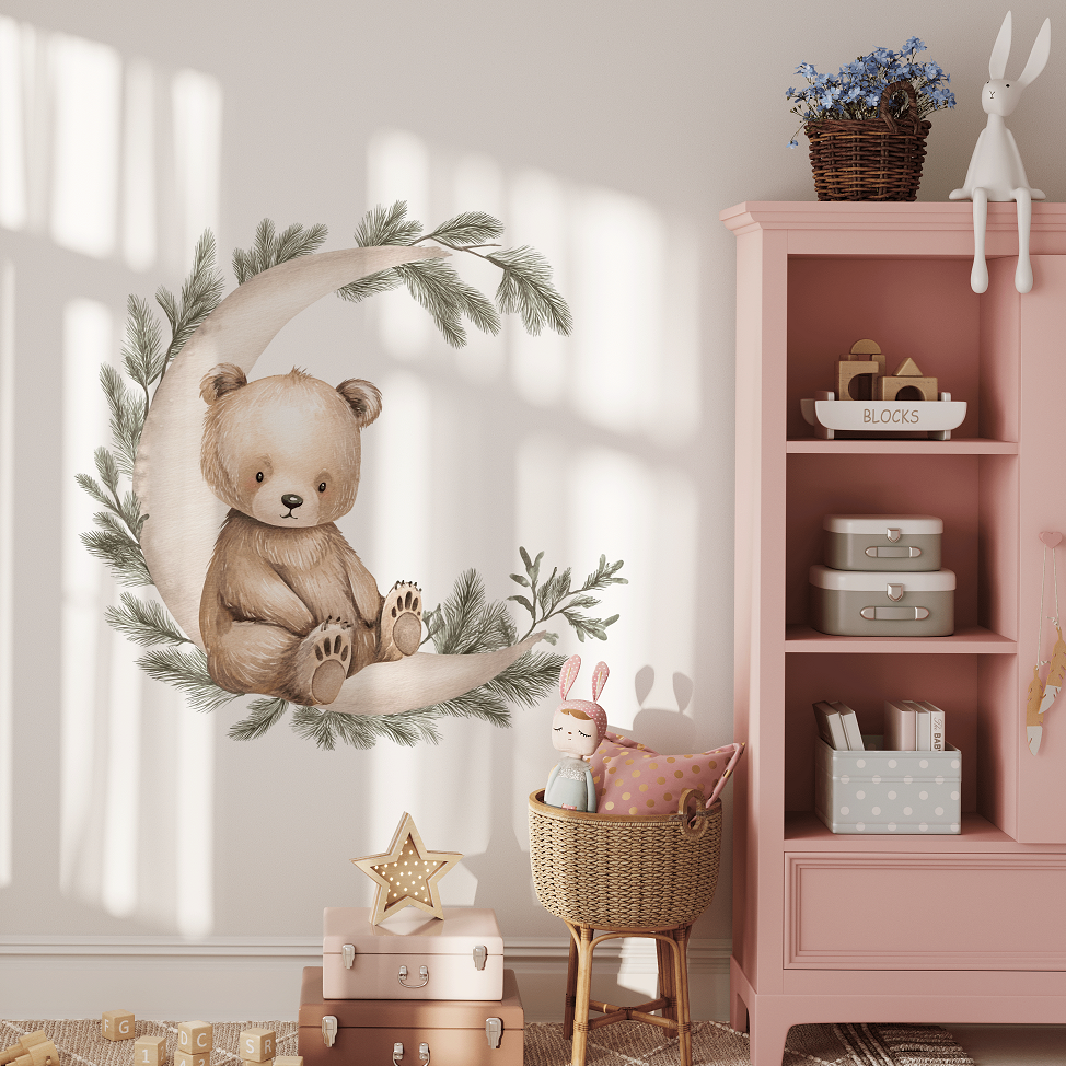 Arkusz naklejek ściennych 100 × 100 cm z motywem świątecznego misia siedzącego na księżycu. Naklejki wykonywane są na wysokiej jakości folii samoprzylepnej i wycinane po obrysie, co ułatwia aplikację i pozwala dowolnie ułożyć kompozycję na ścianie. Idealne do stworzenia delikatnej, świątecznej dekoracji w pokoju dziecka.