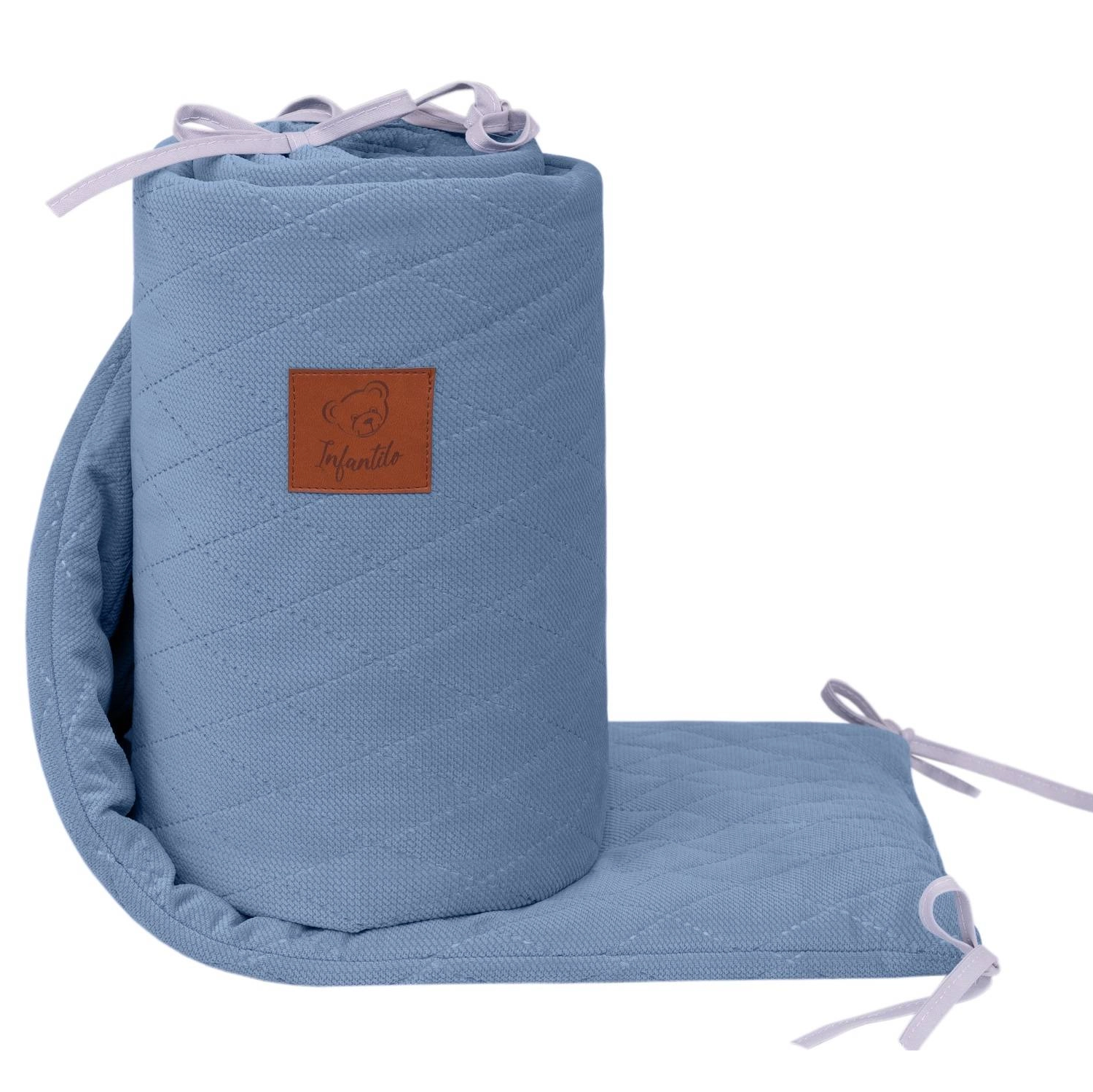 Ochraniacz wiązany jest na troczki, dzięki temu nie przemieszcza się w łóżeczku.