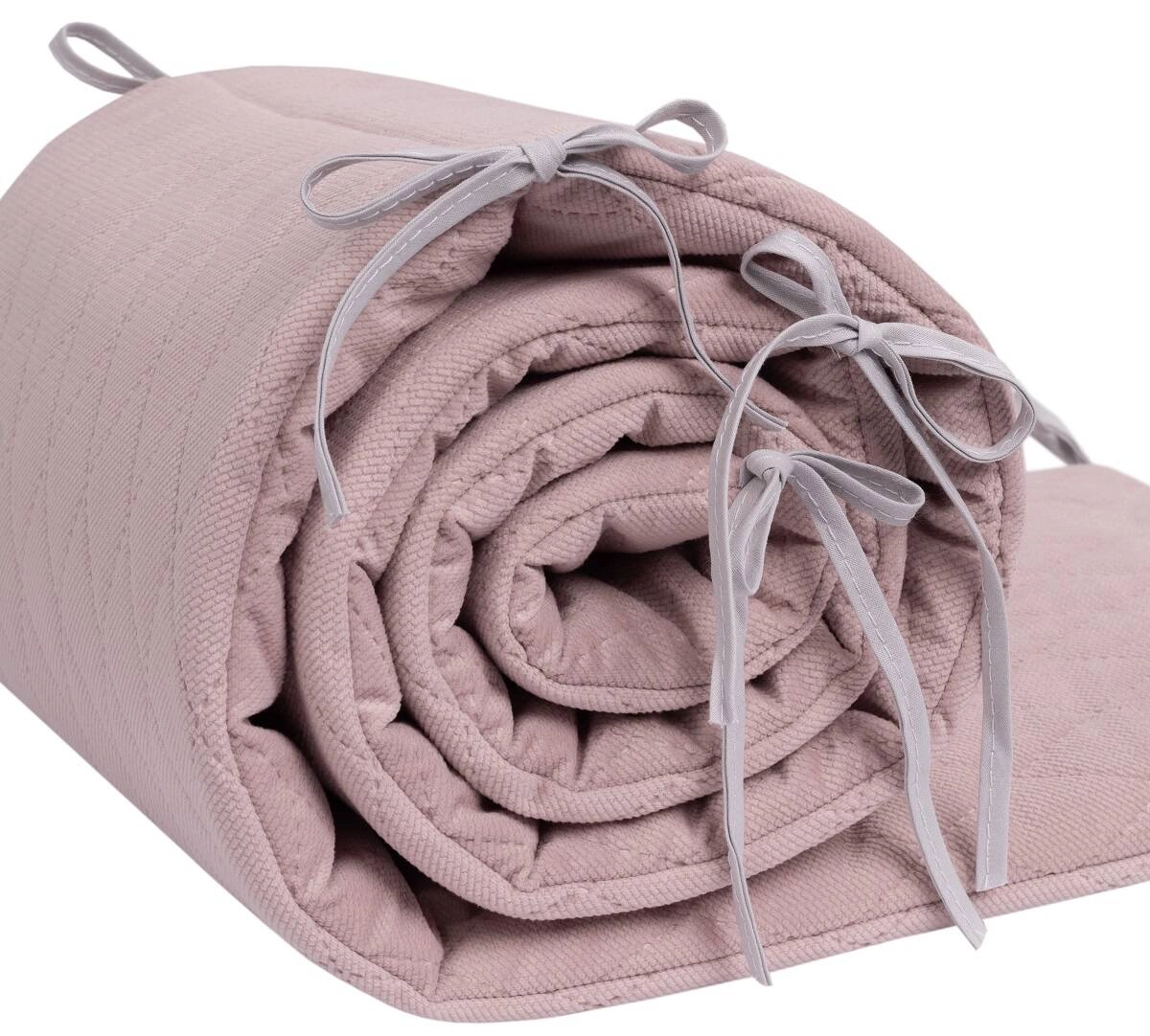 Ochraniacz wiązany jest na troczki, dzięki temu nie przemieszcza się w łóżeczku.