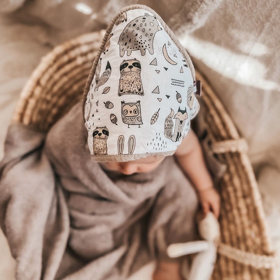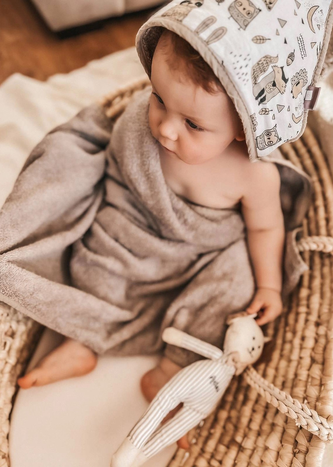 Kapturek okrywający głowę doskonale wchłania wodę, dokładnie osuszając delikatną skórę dziecka.