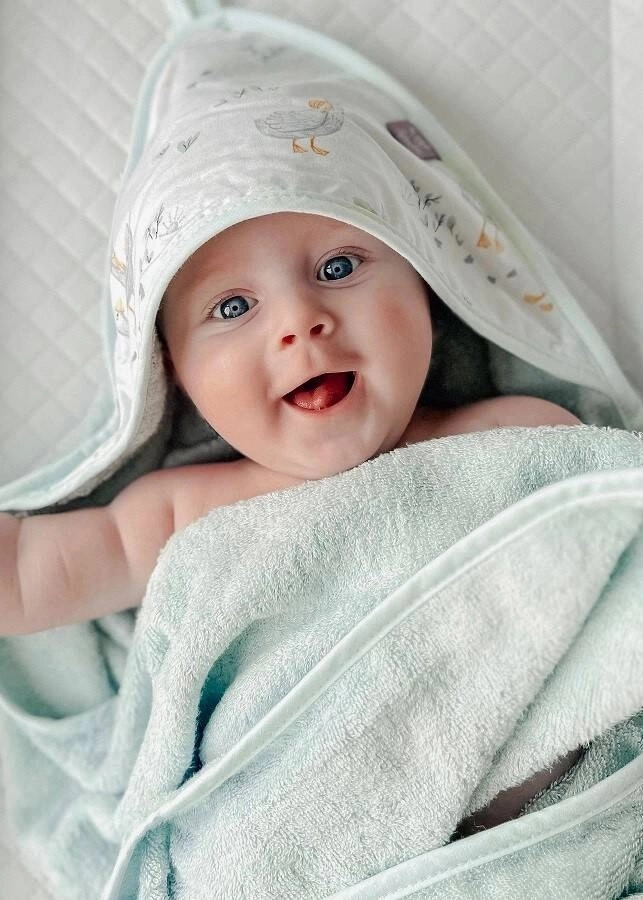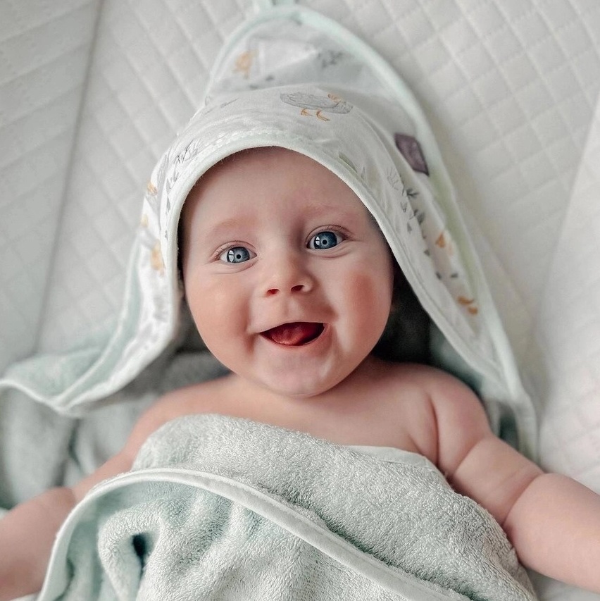 Kapturek okrywający głowę doskonale wchłania wodę, dokładnie osuszając delikatną skórę dziecka.