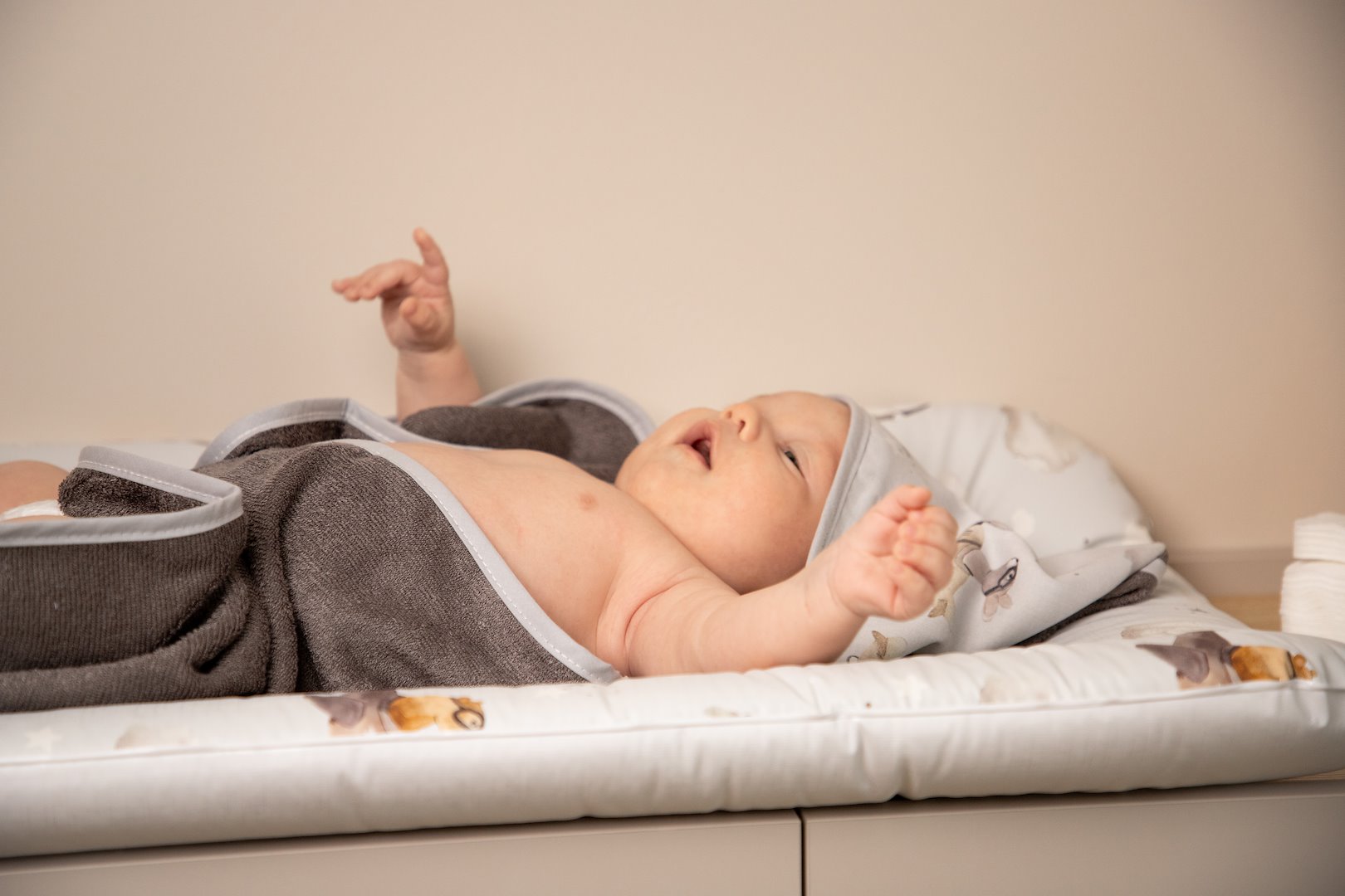 2. Praktyczny design z kapturkiem: Dostępny w rozmiarze 50 × 120 cm z doszytym kapturkiem, ręcznik jest łatwy w użytkowaniu podczas owijania i otulania dziecka po kąpieli, zapewniając mu ciepło i komfort.